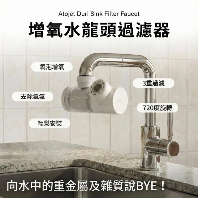 屋企水龍頭出水經常有怪味?洗完面感覺油油的?可能係水管有污濁,順著水帶了出來。想輕鬆解決這些問題,其實很簡單,只需5分鐘安裝Atojet Duri Sink Filter,安裝過程超簡單,3重過濾,將重金屬及雜質通通阻隔,細分水中空氣層,更有助滋潤皮膚,讓肌膚變得更好,最棒的是還有720度旋轉,上下左右無阻礙,方便大家不同需求,快點感受最潔淨的水質吧!