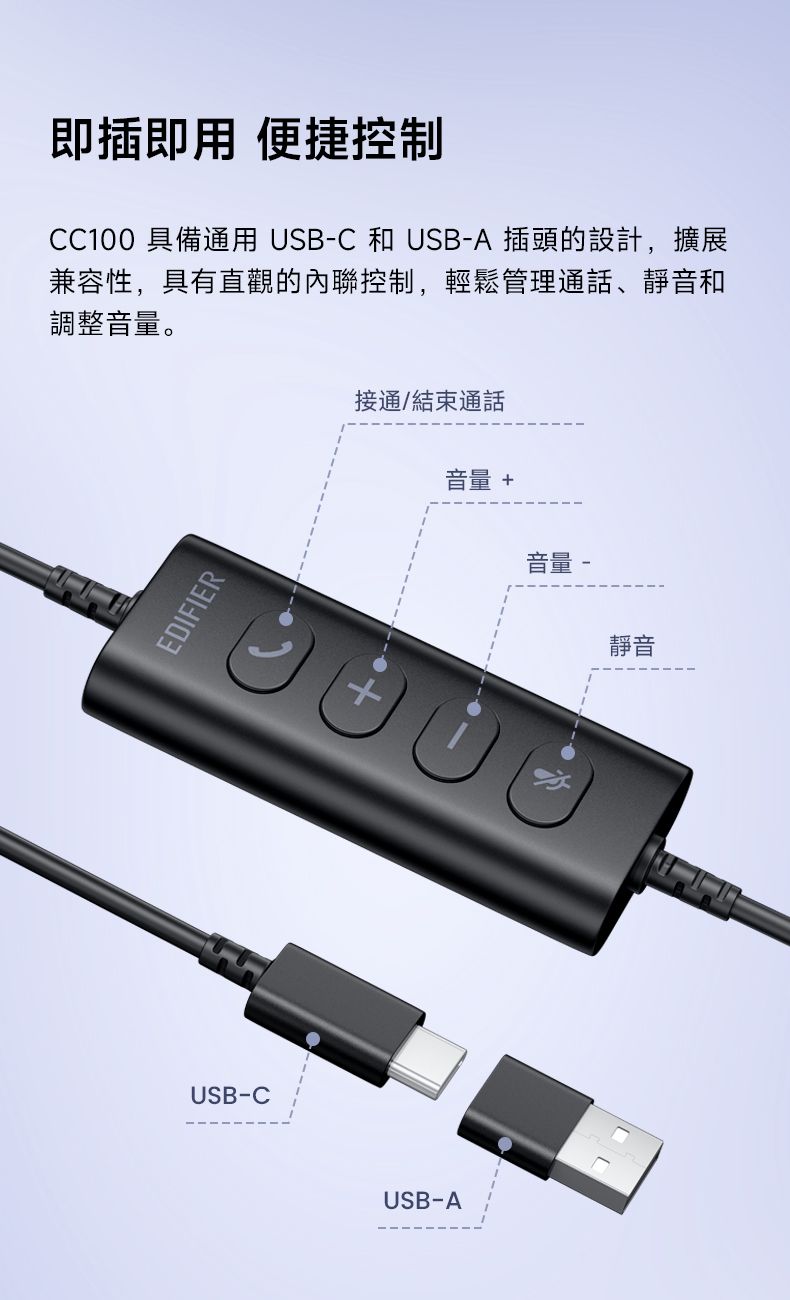配備內聯控制器,可輕鬆接聽/結束通話,調整音量,靜音/取消靜音通話。