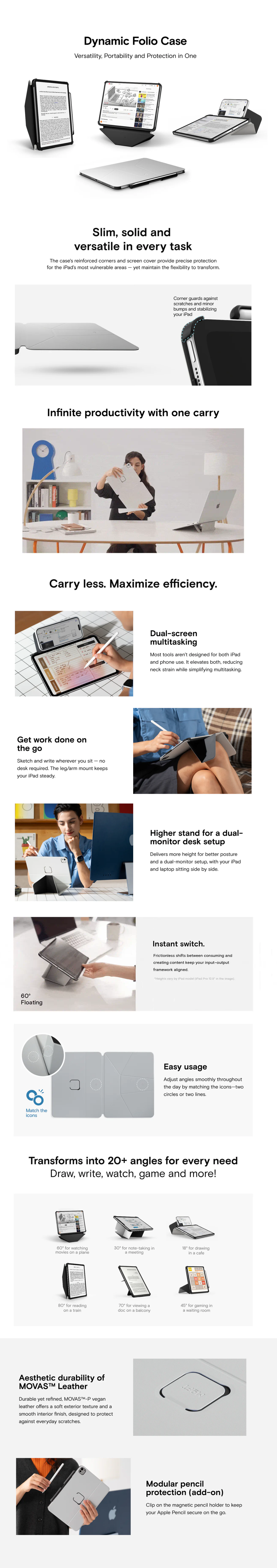 大多數工具並非為iPad和手機同時使用而設計。這款保護殼可同時抬高iPad和手機,減輕頸部疲勞,並簡化多工處理。